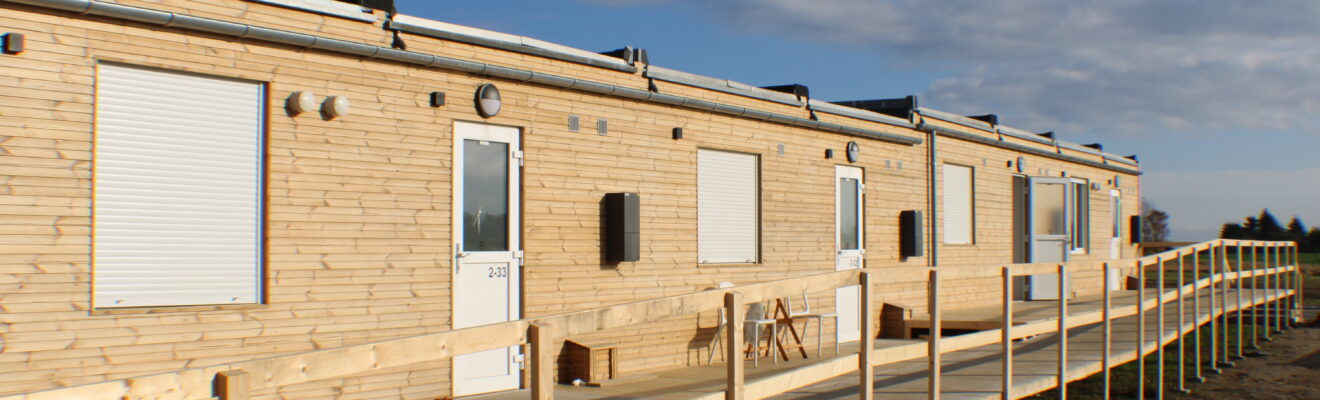 Udvendigt er modulerne beklædt med tagpap på tagfladerne og lange Thermowood-planker i fyr, som giver bebyggelsen et varmt, naturligt og mere permanent udtryk. Materialevalget skaber en rolig helhed, der falder naturligt ind i omgivelserne og understøtter oplevelsen af hjemlighed – også i en midlertidig løsning.