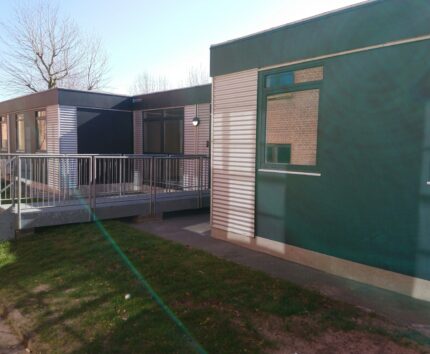 Midlertidige undervisningslokaler med mellemgang og toiletfaciliteter Bygningen består af 10 stk. multimoduler af størrelsen MM12, fordelt på fire rummelige og lyse undervisningslokaler på 79,2 m2, et gangareal på 55,5m2, toiletareal