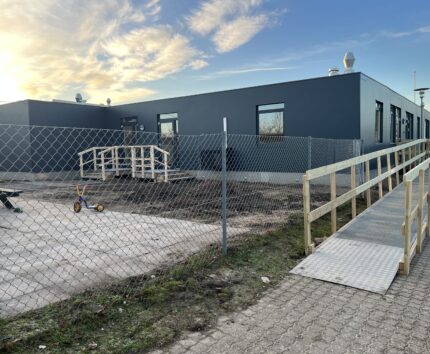 Midlertidig daginstitution med fire stuer, fællesarealer og personalefaciliteter Bygningen består af 14 stk. multimoduler af størrelsen MM12, fordelt på fire stuer på 56/57 m2 med tilhørende garderobe og pusle/toiletfaciliteter, et