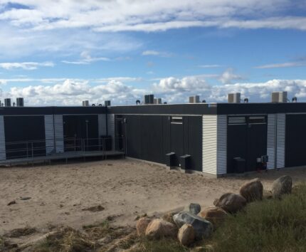 Midlertidige beboelsesfaciliteter med opholdsrum samt toilet og bad Bygningen består af 5 stk. multimoduler af størrelsen MM12, fordelt på seks værelser af 16 m2, et opholdsrum på 45 m2, et